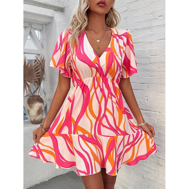 women Breezaya Floral Print V-Neck Ruffle Hem Short Sleeve Dress