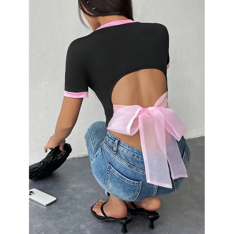 Chiquease Women’s Crew Neck Colorblock Chest & Collar Detail Fitted T-Shirt With Back Tie-Up Detail,