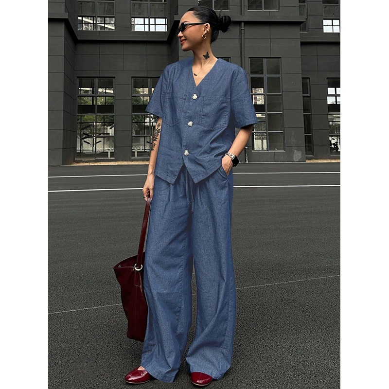 DAZY Women's V-Neck Denim Suit Set, Spring/Summer
