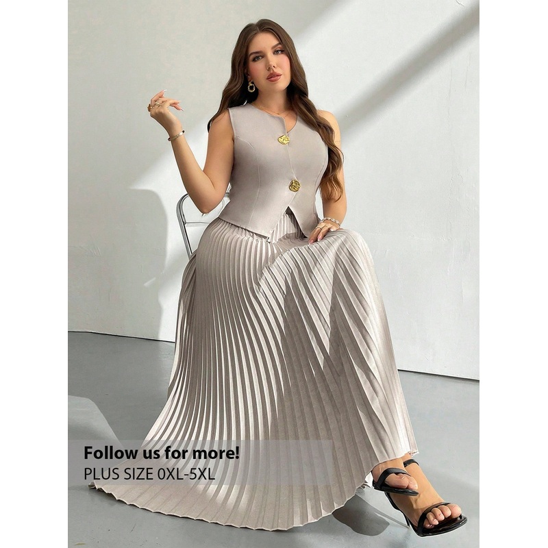 Firerie Plus Size Women's Elegant "Prive" Asymmetric Metal Button Pleated Skirt And French Vest Two Pieces