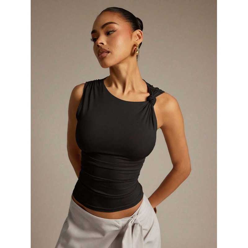 Hauture Women's Solid Color Twisted Asymmetric Collar Sleeveless Top, Slim Fit Summer