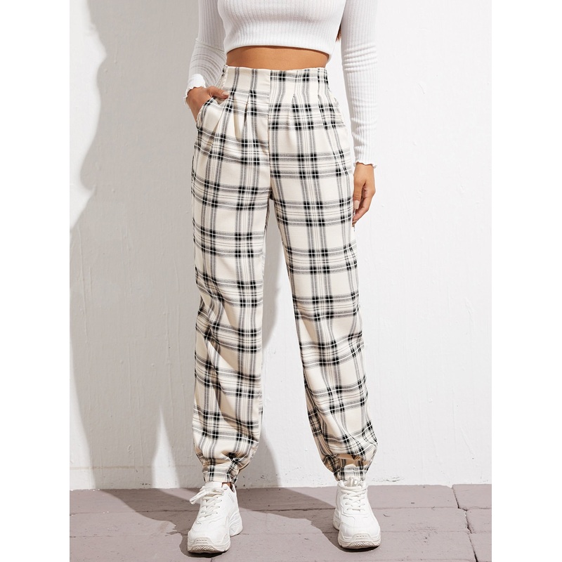 SHH-4438-AIRQHigh Waist Fold Pleat Tartan Pants