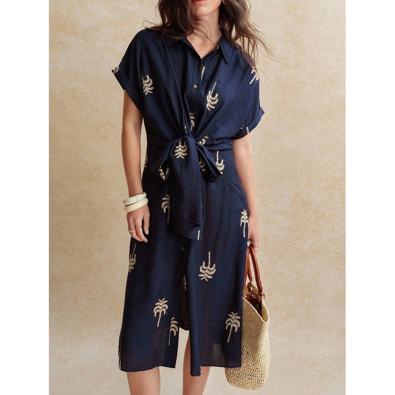 losa Fashionable Vintage Versatile Daily Shirt Collar Dolman Sleeve Button Twist Bowknot Long Dress