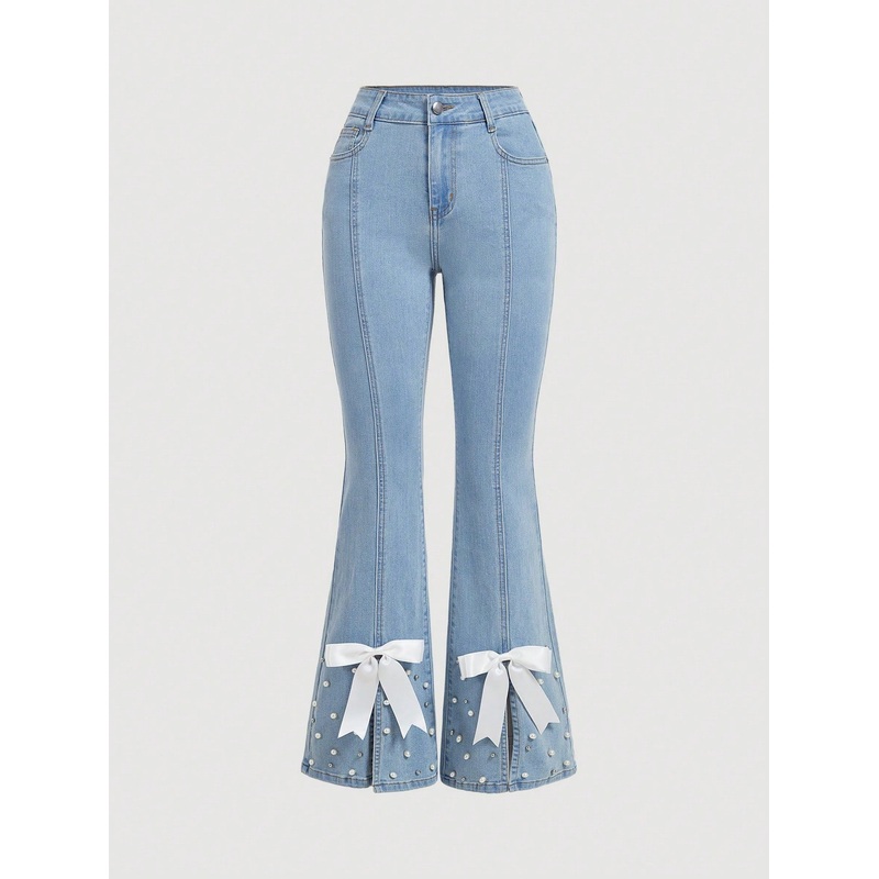 MOD Women Beaded Bow Decoration Split Flared Denim Jeans