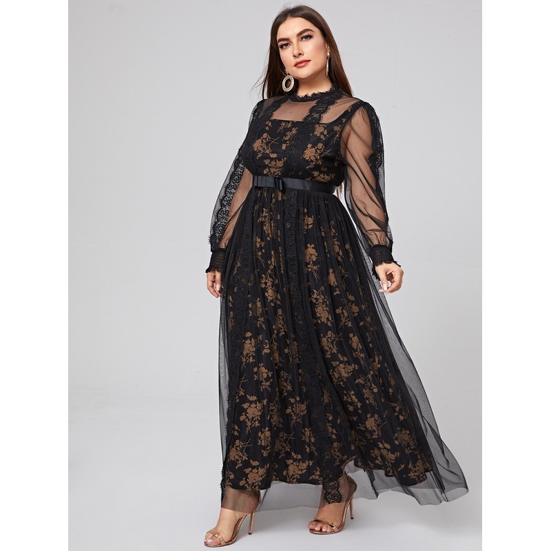 Plus Eyelash Lace Tape Bow Waist Mesh Overlay Floral Dress