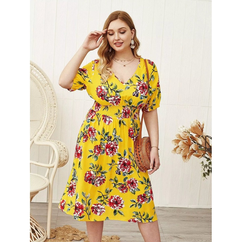 SHH-1515-NWUSPlus Floral Print Shirred Waist A-line Dress