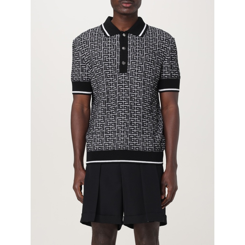Style: Casual, Contemporary Neck: Classic Shoulders: Regular Sleeves: Short Closure: With 3-button placket Bottom: With straight hemline Model: Knit Materials: Merino wool Pattern: Monogram Logo: Balmain PB Labyrinth monogram