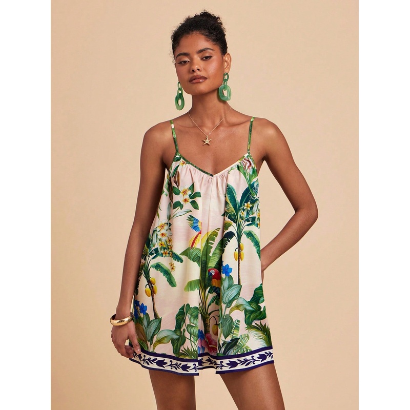 Travachic Vacation Casual Tropical Print Camisole Romper,Suitable For Holiday Date, Afternoon Tea, Wedding