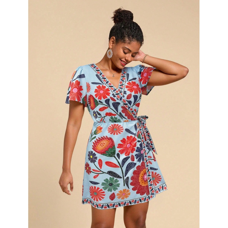 Travachic Women's Floral Print Ruffle Sleeve Casual Mini Dress For Vacation,Mexican Women Dresses,Vacation