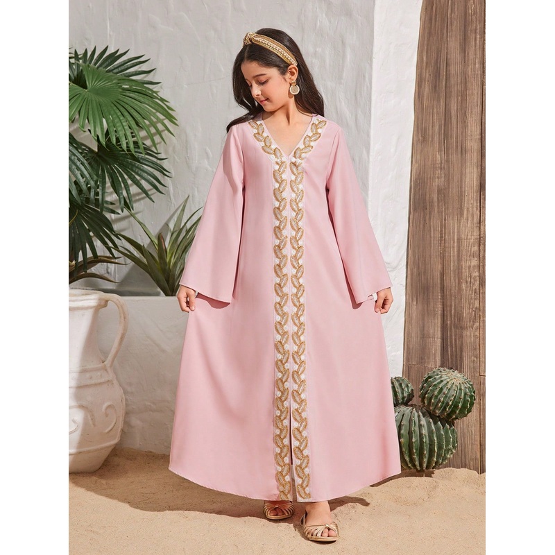 Tween Girl Elegant V-Neck Long Sleeve Midi Dress, Retro Style