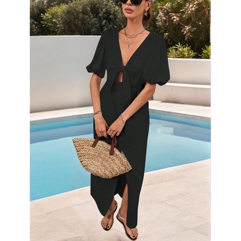 VCAY Women's Solid Color Front Knotted Lantern Sleeve Open Hem Dress Vacation Outfits Women,Bohemia