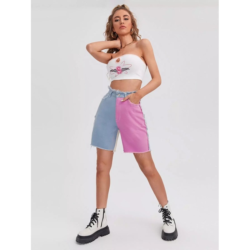 SHH-0835-ZKIKZipper Fly Raw Edge Colorblock Denim Shorts